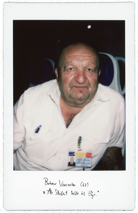 Mit ihnen fährt Bobrov Veaceslav – Schaffner, Universalversorger, Anlaufstelle bei Problemen. Behutsam gießt er heißes Wasser in Pappbecher. Er steht hinter der Servicetheke, neben ihm Teepackungen und kleine Löffel. Früher war er Kanulehrer. Die körperliche Arbeit machte aus dem Jungen eine Bulldogge. Eine Bulldogge in einem weißen Hemd, das sich über seinen Bauch spannt und aus dessen Ausschnitt sich Haare kräuseln.